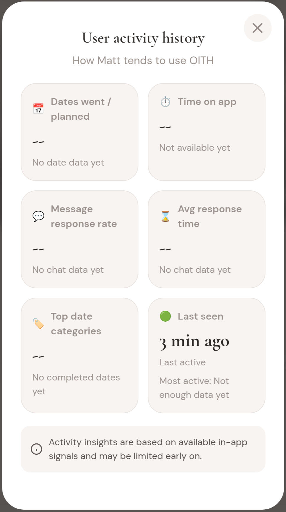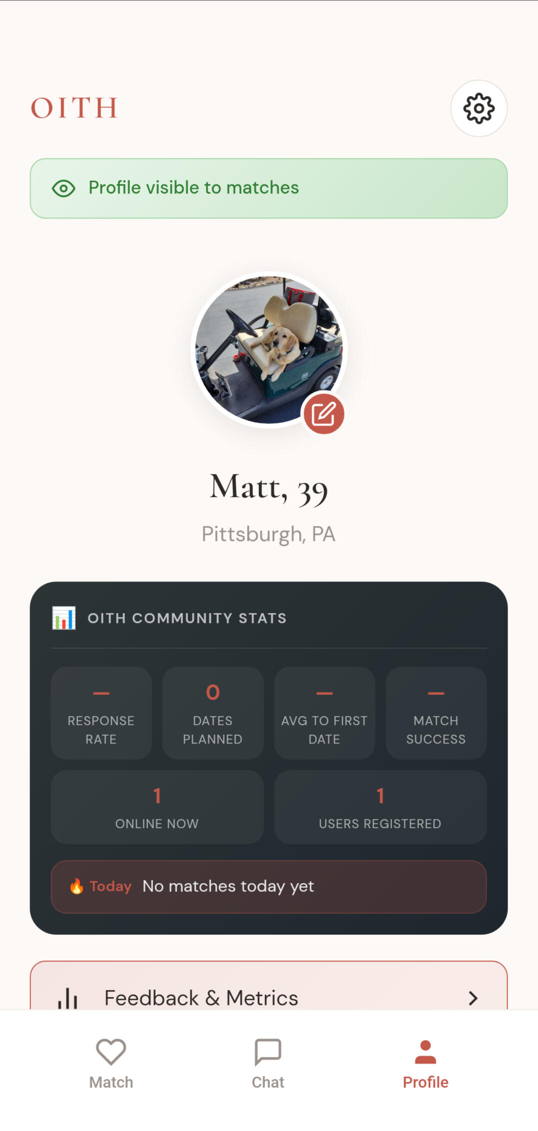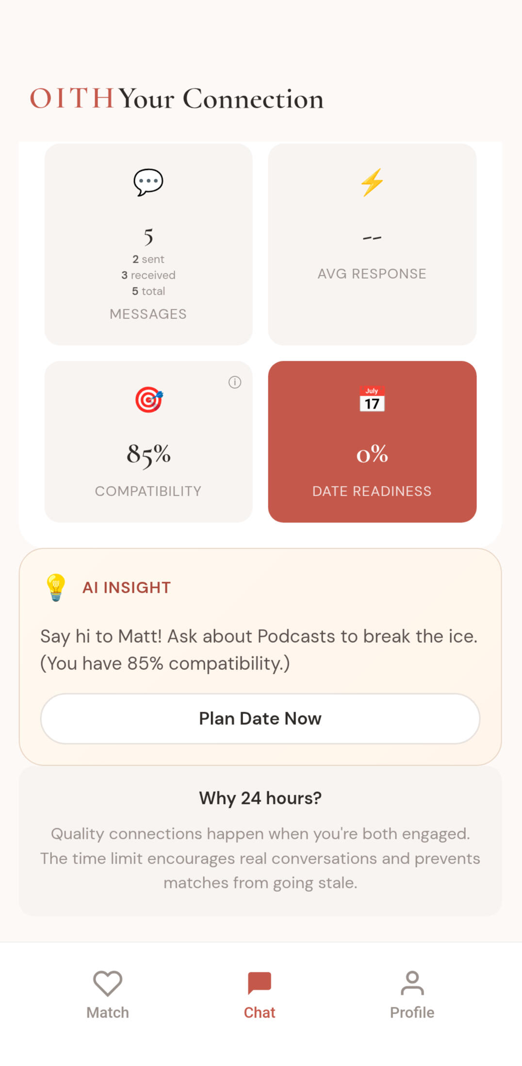 OITH is designed to reduce swipe fatigue and help users focus on meaningful connection. With one match at a time and a structured path to real-world dates, the experience is built around outcomes instead of endless browsing.