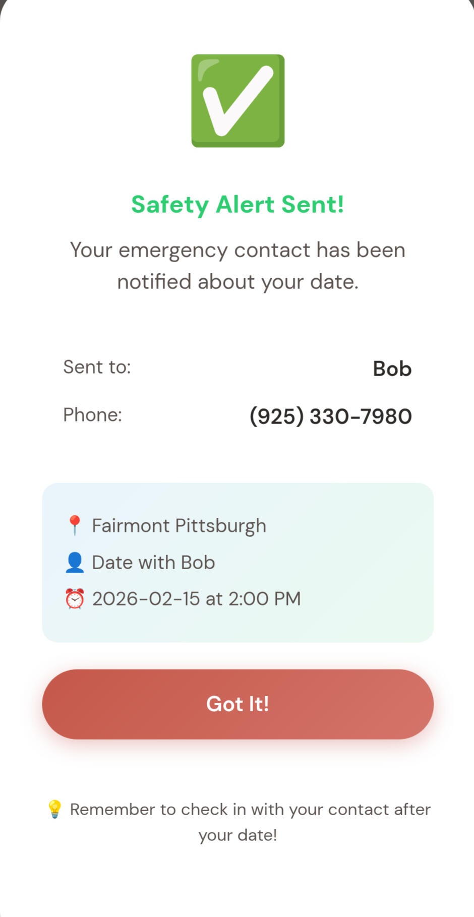 OITH includes fully customizable integrated safety alert tools designed to support safer in-person dating, including the ability to notify a trusted contact with important date information.